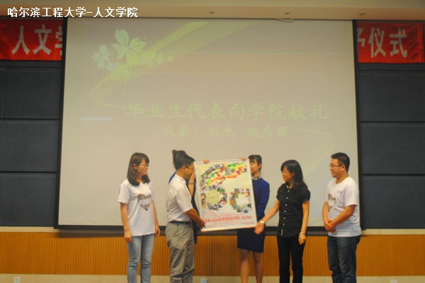 教师代表韩晋发言。他代表全体教师祝福毕业生,希望毕业生们脚踏实地,继续求索,并学以致用,不断向前,不断奋进,从此扬帆远航,追求梦想。然后,毕业生代表向学院献礼,感谢学院的培训和关爱,并深深祝福学院。