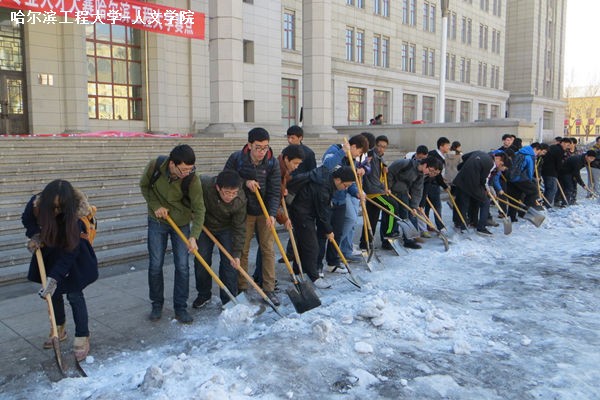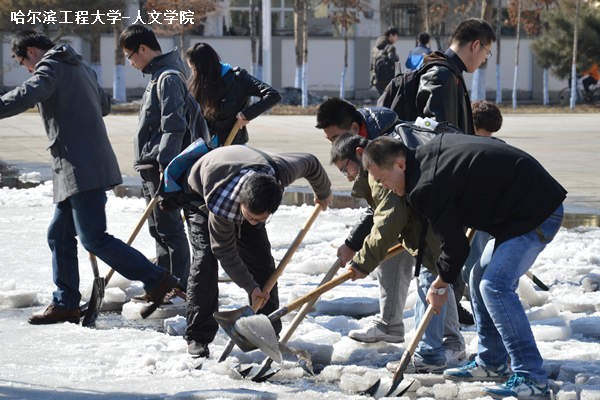活动开始前,杨国庆发表简短讲话,指出本次活动对于彰显人文精神、发扬奉献美德的重要意义。同时鼓舞师生们卯足干劲地投入清扫积雪的活动中。经过简单分工后,全体人员就有条不紊地忙碌起来。男生负责铲冰以及运送大块冰雪,女生主要负责清理冰屑与雪堆,而老师们在一旁进行指挥分工后也加入铲雪的队伍中。