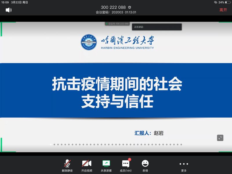 3月22日下午,由省社科联和省社会学学会、省社会工作学会、省社会心理学会联合举行的“黑龙江省抗击疫情的社会支持与信任”理论研讨会,以腾讯线上会议的形式如期召开,会议共邀请5位专家做主题报告,会议历时近3个小时,参会人数达160人。