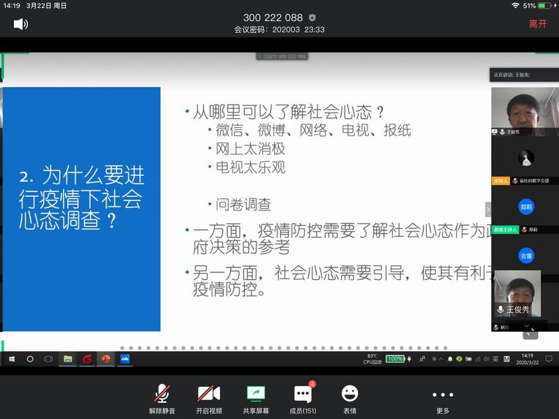 中国社会科学院社会学所社会心理研究中心的主任,万博max体育app下载特聘教授王俊秀研究员报告主题是“全国疫情期间社会心态追踪研究”。王俊秀研究员首先谈了进行疫情下社会心态调查的必要性,并从疫情关注与风险认识、社会情绪、疫情信息获取和评价、民众的疫情防控行为四个方面为与会者讲述了疫情下全国社会心态的演变。最后,王俊秀研究员指出研究者今后要关注的问题:不信任下的风险防范、临时的命运共同体、不可控风险的厌恶与不接受、流动性下网格化难题以及个体化的社会动员等。