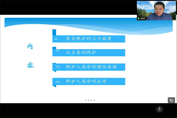 讲座开始,程瑜教授结合自身经历介绍了有关照护的三个故事,进而指出照护不仅仅是医学上的问题,还是最接近“人意味着什么”这个问题的一种回答。接着,程瑜教授阐述了互惠与照护的联系,并揭示了照护人类学的理论的来源:作为现代护理学和临床基础的人文护理、作为社会整合方式的照护和对社会苦难的回应,并指出了当代照护理论缺乏来自东方的理论整合。最后,程瑜教授用“整体观与全人护理”“跨文化比较”“社会照护”三个方面总结了照护人类学的应用。
