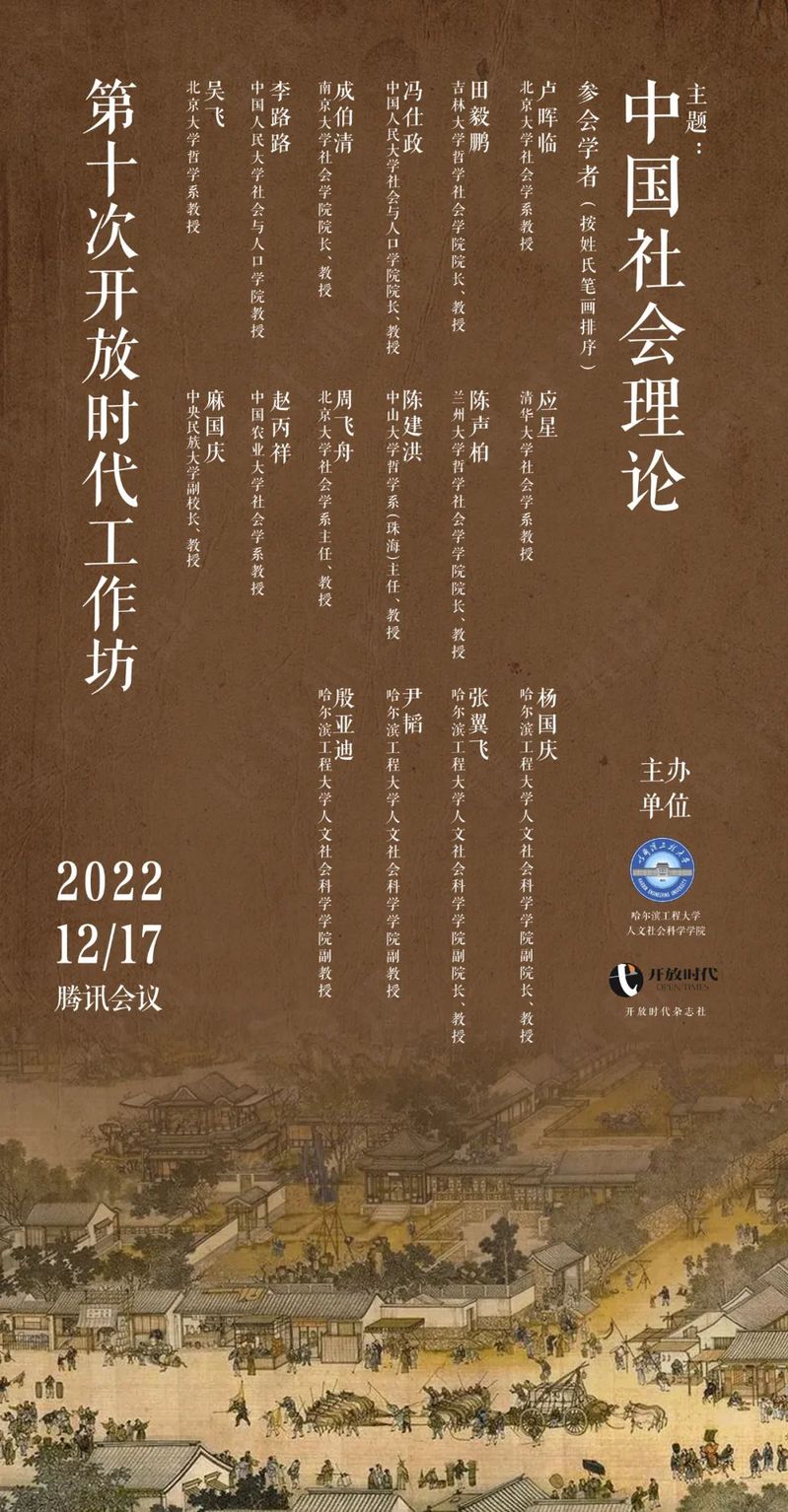 2022年12月17日,由开放时代杂志社、万博max体育app下载共同举办的第十次开放时代工作坊通过腾讯线上会议方式举行,来自北京大学、清华大学、中国人民大学、中央民族大学、南京大学、吉林大学、兰州大学、中山大学、中国农业大学、万博max体育app下载的16位专家学者参会发言。此次工作坊的主题是“中国社会理论”。
