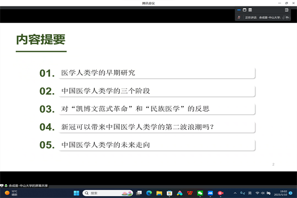 讲座开始,余成普教授介绍了医学人类学的早期研究,引出了此次讲座的内容:医学人类早期的“应用”与“理论”之争。接着,余成普教授对中国医学人类学的三个阶段进行了阐述,具体分为引介阶段、学科理论的应用阶段、田野和理论并重,并仔细讲述了各个阶段的代表人物以及代表作品。之后,余成普教授从“凯博尔范式革命”当作切入点,分析了“凯博尔范式革命”对医学人类学和中国的深刻影响,挖掘了凯博尔的基本方法论,从中深入理解了基本方法的好处和弊端,对“凯博尔范式革命”进行了深度反思,向师生解释出自身对“凯博尔范式革命”的见解。此次,余成普教授又从其中引申到“民族医学”,为了方便师生理解,余成普教授列举了几个通俗易懂的例子,引出了医院民族志,说明了现在既有的对民族医学的两种研究路径,即民族信仰和医药,引申解释了对民族医学的反思。然后,余成普教授分析中国医学人类学的第一波浪潮,讲述了其中可能的推动力,探讨了中国医学人类学第二波浪潮的可能性,表明了新冠疫情在其中所造成的影响力。同时,余成普教授用自己的见解阐述出了疫情对于人类学学科的影响。最后,余成普教授向在场师生说明了医学人类学未来的走向,并分为了五个方面,从不同的角度表达了对于医学人类学未来发展的期望。