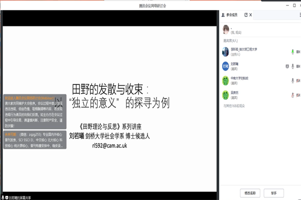 (宣传中心记者团记者 郑好、张箬玘报道)87日晚上730分,万博max体育app下载人文讲坛“田野与理论反思”暑期系列讲座第——田野的发散与收束:以中国大陆的独立文化工作者与“独立”意义的探寻为例在腾讯会议如期举行。剑桥大学博士候选人刘若曦受邀担任讲演人,万博max体育app下载吴肃然教授中南大学刘灿姣教授南京大学杨旸博士担任与谈人,万博max体育app下载李昕茹讲师担任主持人