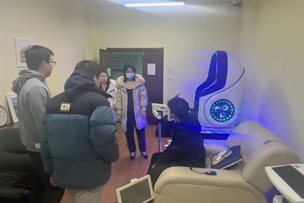 首先,讲解员引导同学们进入心理治疗室进行参观,为同学们进行了有关室内设施的讲解和介绍,促进了同学们对于心理治疗步骤的了解。随后,讲解员带领同学们走进心理督导室,讲解了在信息化背景下,心理辅导设施的发展和变化,并让同学们体验了减压器等一系列设备,使同学们对心理减压的相关设计与应用有了更加深刻的认识。最后,同学们跟随讲解员的脚步参观了团体辅导室,讲解员与同学们一起进行了器械的使用和体验,并帮助同学们了解了辅导过程的实现流程。