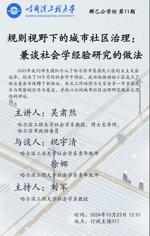 2023年我们师生团队介入了哈尔滨市某居民小区的业主大会选举,经历了14个月的社会学干预后,成功地推动该小区成立了新业委会并改聘了新物业。本次工作坊将与大家分享一年多深度参与观察的经历与感受,并就以往的城市社区治理研究做出反思性的评述。