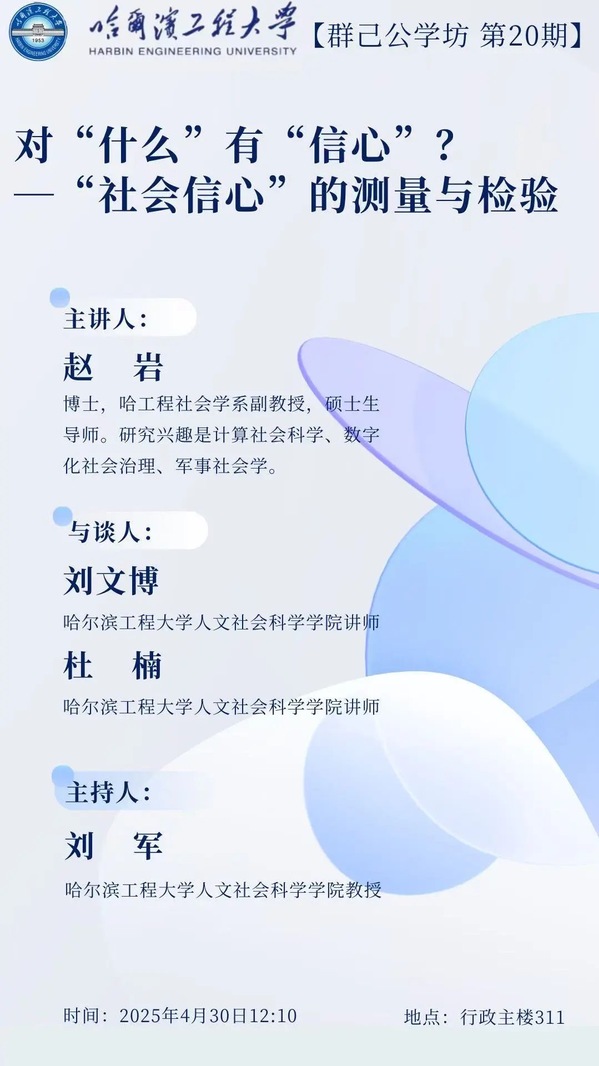 赵岩,博士,哈工程大学社会学系副教授,硕士生导师。研究兴趣是计算社会科学、数字化社会治理、军事社会学。