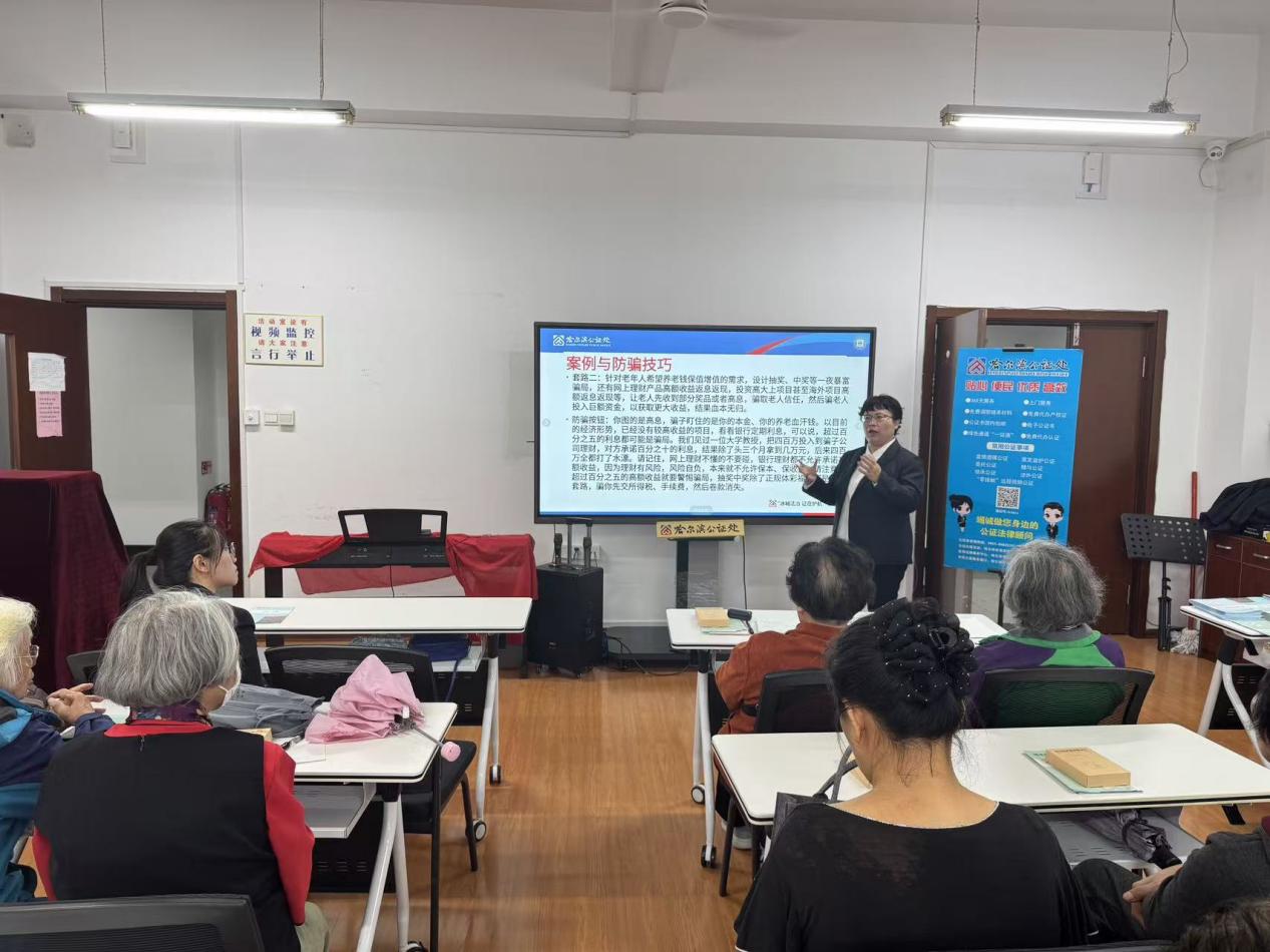哈尔滨公证处副主任寇玉芳在活动中结合典型案例,深度剖析了当前针对老年人的新型诈骗套路。她指出,诈骗分子常以“保健品投资”“虚假养老项目”“冒充亲属借钱”等名义设局,抓住老年人注重健康、渴望关怀、防范意识较弱的特点实施诈骗,并针对这些套路,现场普及相应的实用防骗技巧。