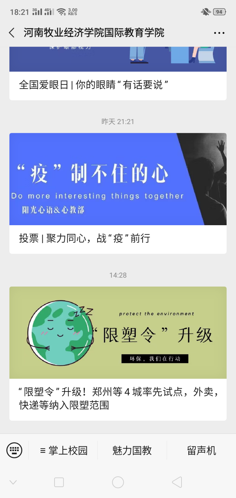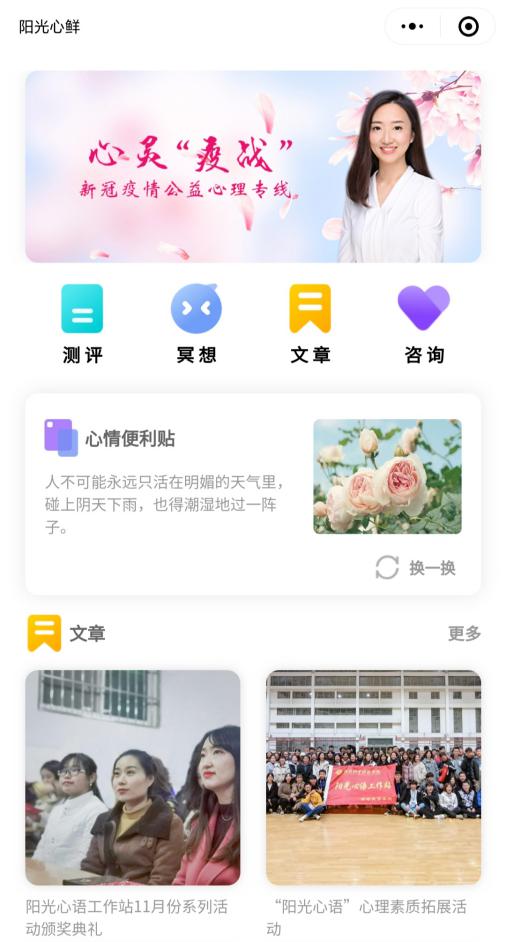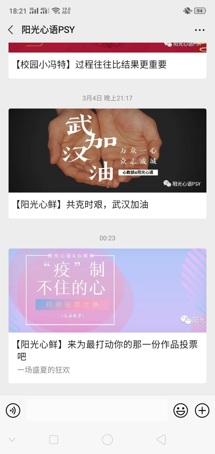 “525大学生心理健康月”期间,我们充分利用了线上技术资源。bat365在线中国官网登录入口阳光心语工作站首当其冲,进行了爱心帮扶线上心理问卷调查,问卷内容由bat365心理专干丁玮老师亲自设计,问卷涵盖了家庭经济情况普查、家庭关系情况普查、自身心理情况变化调查等几方面的内容,通过本问卷调查可全面并真实的了解到同学们近期的心理变化。同时我们建立了“阳光心鲜”小程序,开通了与国教院心理专干丁玮老师的对话直通车,对国教院全体学生开放,存在心理疑惑的同学都可以进行专业的心理辅导。丁玮老师为国家二级心理咨询师,从业八年,拥有丰富的实战经验,咨询风格亲和温润,共情能力一流。同时为了让同学们更好的认识此次肺炎疫情,迎接抗疫收官之战,保护自身安全,bat365在线中国官网登录入口在官方微信公众号上发布了由心教部携手阳光心语工作站共同创作的“防疫正当时”抗疫视频,宣传防护知识,对疫情期间存在的误解和不实信息进行讲解,缓解同学们的紧张情绪。与此同时,为期五天的“阳光日记”专题心理健康知识推送与战“疫”知识大挑战心理健康知识竞赛也在紧锣密鼓的进行,本次微信公众号“组合拳”宣传教育效果显著,达到了普及相关心理健康科学知识,帮助学生提高自身的心理调适能力和目标。
