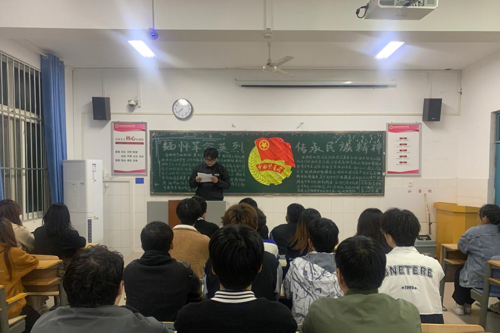 团支书介绍了革命先烈的英勇事迹,无数革命先烈浴血奋战、前赴后继,用铮铮铁骨保卫家园,以生命和鲜血换来了今天中国人民来之不易的幸福生活,使同学们更深切地感受到了先烈们矢志不移的革命意志、英勇无畏的革命精神。然后团支书播放视频,邀请3位同学代表发言,通过同学代表发言让学生了解到,要懂得幸福美好生活的来之不易,更要继承革命先烈遗志,积极树立社会主义核心价值观,勇做时代潮头的开拓者、奉献者、奋进者,努力成为新时代高素质铸魂育人的中坚,为实现中国梦奉献智慧和力量。