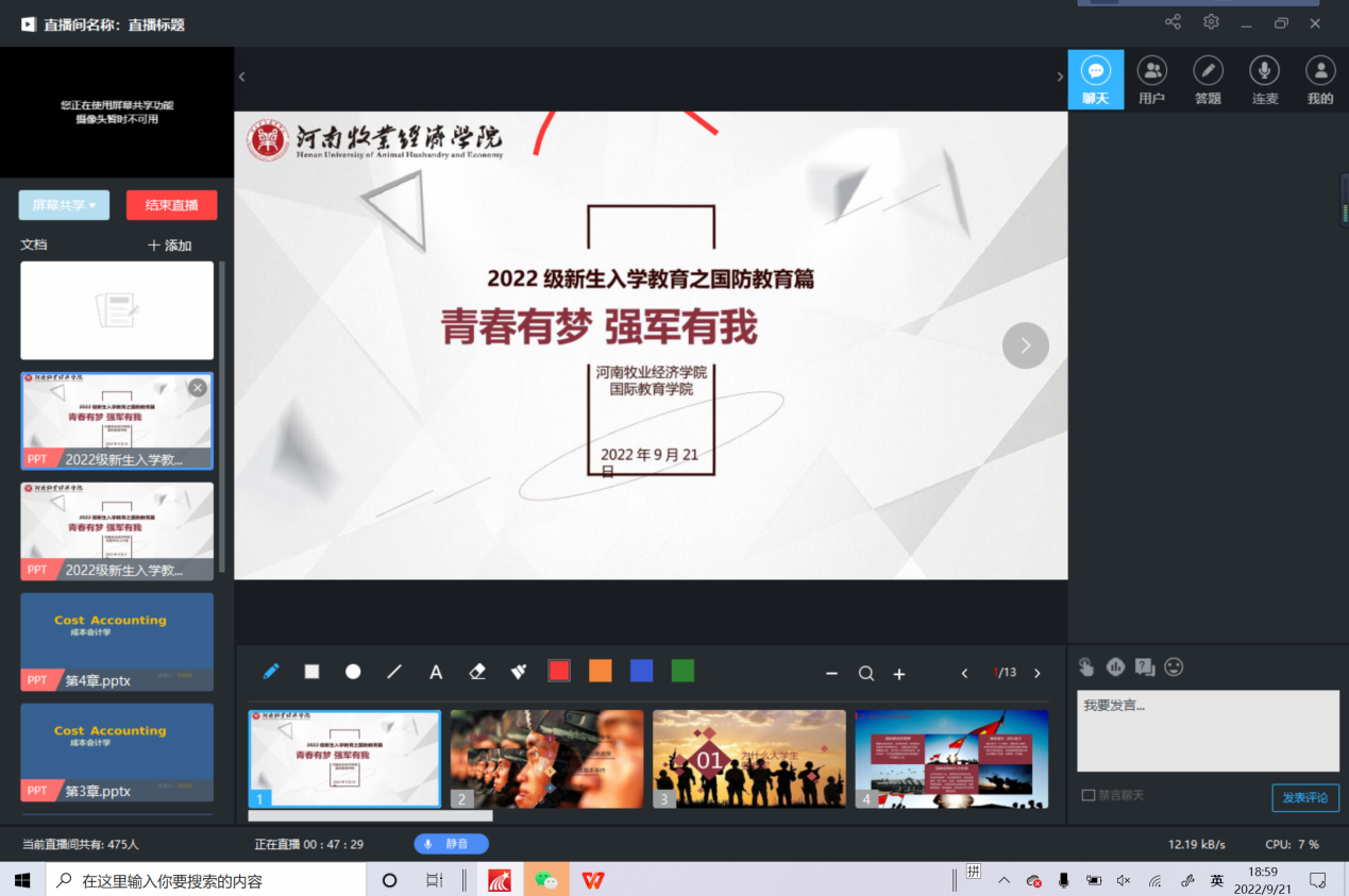 古之立大事者,不惟有超世之才,亦必有坚韧不拔之志。为加强新生国防教育观念,强健学生体魄,使国防教育常态化,培育国防后备人才,9月21日晚上,bat365在线中国官网登录入口组织全体2022级新生开展了以“青春有梦,强军有我”为主题的线上国防教育。本次国防教育专题讲座由刘颖颖老师主讲。