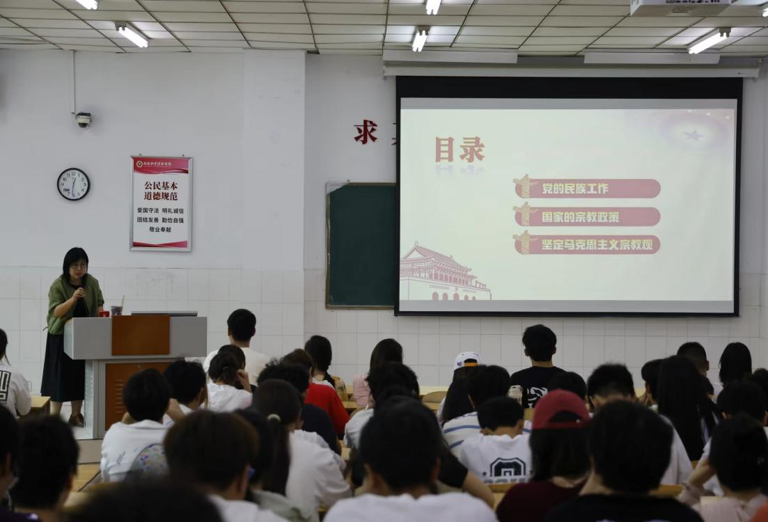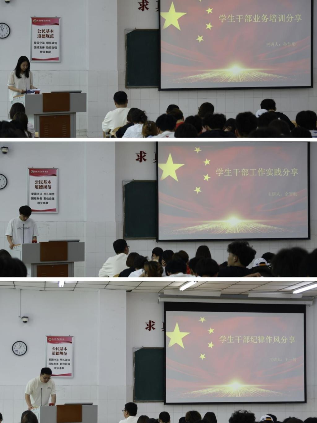 本次会议特别邀请了统战部民族宗教科科长霍婧媛老师,以及三位优秀学生干部代表进行讲解。霍婧媛老师从党的民族工作、国家的宗教政策、坚定马克思主义宗教观三个方面对学生干部进行了民族宗教理论知识培训。紧接着,三位优秀学生干部代表分别针对业务培训、工作实践、纪律作风三个不同的方面进行经验分享。主席团成员孙佳彤,从业务流程方面告诫我们要注重总结,讲究工作的方式方法;主席团成员余智航,以志愿活动为例,从加强团队协作等方面向我们提出要求;纪检部部长王一博指出:学生干部应该严于律己、以身作则,如此才能在团学会的工作中砥砺前行。会议现场掌声不断,老师与代表们的指导与倡议,深深吸引了在场的每一位学生干部,引起了他们的深刻反思,受益匪浅。