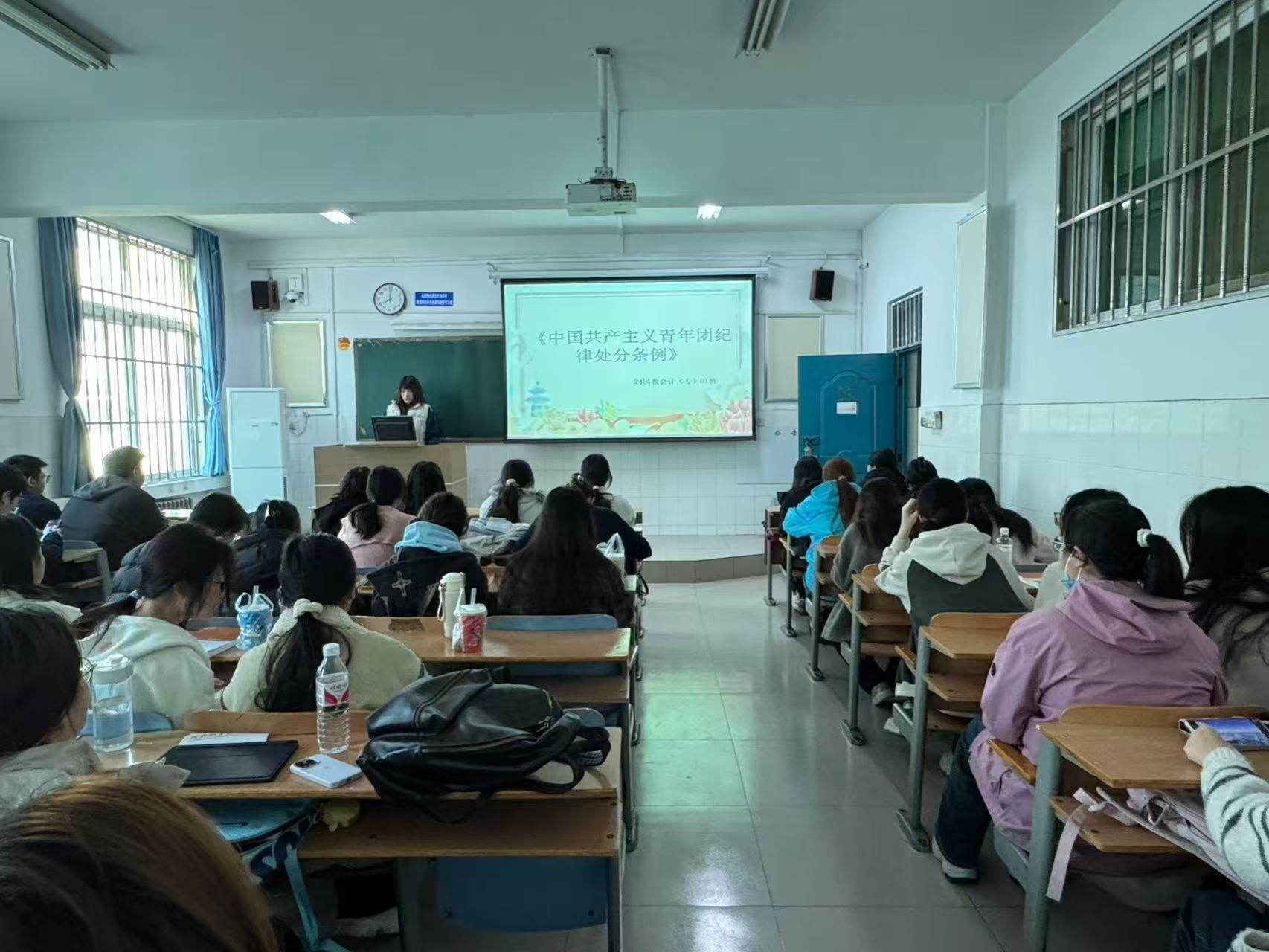 首先由各班级团支书从《中国共产主义青年团纪律处分条例》制定的背景与意义讲起,重点强调了《中国共产主义青年团纪律处分条例》对于规范团员言行、纯洁团的组织的重要性,让团员们深刻认识到:严守纪律是保持共青团先进性和纯洁性的关键。在内容解读环节,各班团支书详细讲解了各项条款的具体内容,并结合校园生活和社会实践中的典型案例,对违纪行为的认定、处分措施进行了细致阐释,使团员们对团员纪律要求有了更直观和深刻的认识。