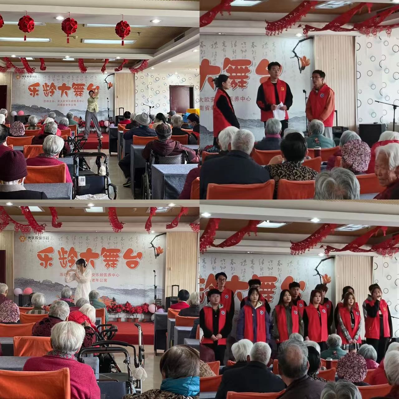 慰问演出一共12个节目。其中,由王景舒、王思雨同学带来的开场舞蹈《桃花朵朵开》,俏皮可爱的表情与动作活跃了气氛,给大家带来了欢笑;徐煊雅同学带来舞蹈《烟火里的尘埃》,动作灵动飘逸,让老人们称赞连连;蒋文清同学带来舞蹈《画中游》,动作连贯,舞姿轻盈,散发着青春的朝气;生活权益部自编自导的历史剧《焦裕禄》,把迎难而上,无私奉献的焦裕禄精神诠释得惟妙惟肖;最后,声乐队带来歌曲《明天会更好》,悦耳动听的嗓音让老人们情不自禁也跟着唱了起来。