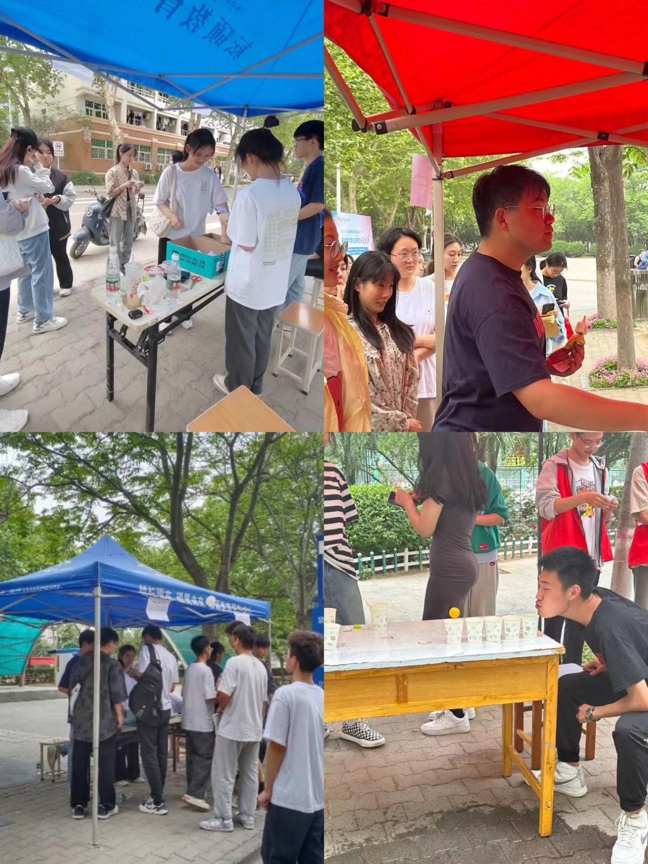 各点位准备好后,参与者陆续多了起来:一号点位的游戏飞花令,要以含某字或意向来背诵诗词:各位同学神采奕奕的在中华文化的洋流中畅游,是“西—随风直到夜郎西”也是“风—任尔东西南北风”;二号点位的游戏是看词识意,又或是柏拉图的考验:“deep love是深沉的爱”、“how much do you love me?你爱我会比最深的海沟要深吗?”;三号点位的游戏需要将乒乓球依次吹至最后一个杯子中,是步步为营,更是本领的考验:一次次的将乒乓球吹进下一个杯子中,怎不像我们人生的一段段成长。四号点位人头攒动,一个个跃跃欲挑战英文的绕口令,读后更有激动人心的扎气球让人沉浸其中。各个点位摩肩接踵,人群如骄阳普照大地,文化犹如碧草春风又生。