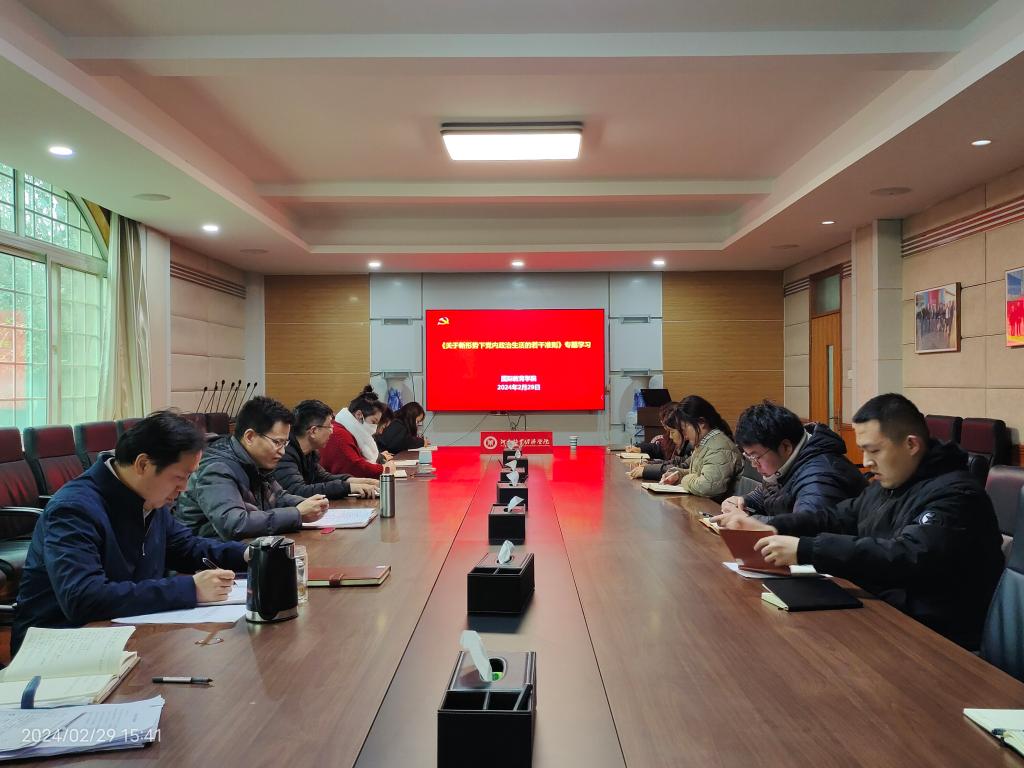 根据校内巡察反馈意见和学院整改工作要求,2月29日,bat365在线中国官网登录入口党委在教学办公楼113会议室召开专题会议,集中学习《关于新形势下党内政治生活的若干准则》(以下简称《准则》)。全体教工党员参加会议。会议由院党委书记贾江主持。