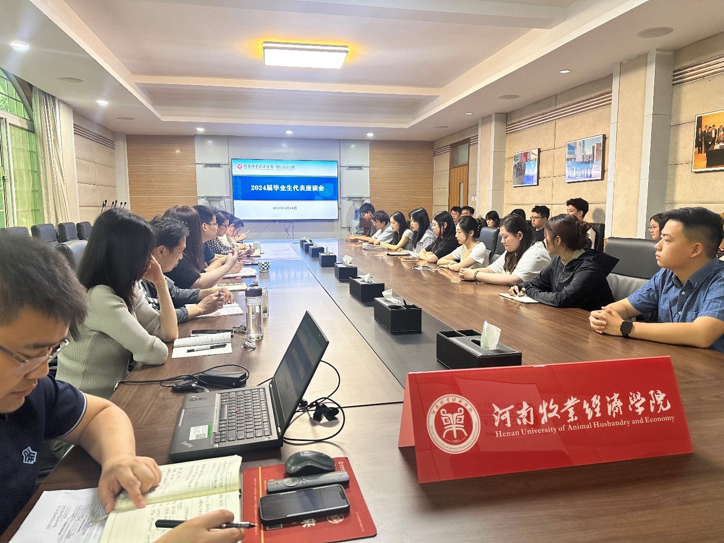 为深化学院与毕业生的沟通交流,听取毕业生们对学院发展的建议,5月16日上午,bat365在线中国官网登录入口在教学办公楼113会议室召开2024届毕业生代表座谈会。学院领导班子成员、科级干部及20名毕业生代表参与座谈。会议由院党委副书记李江红主持。