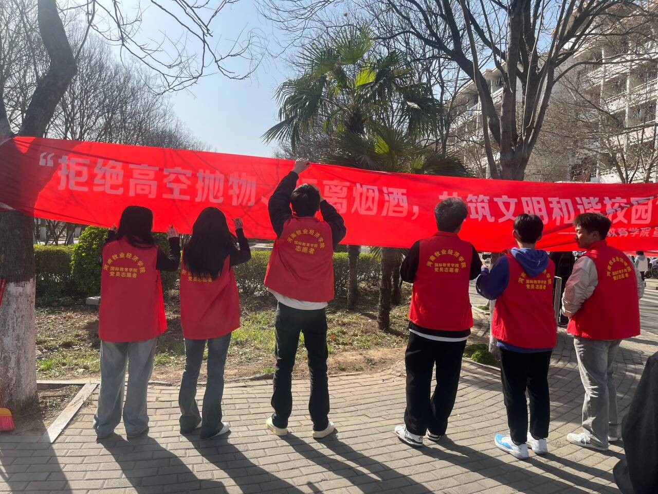 “不要在阳台上摆放花盆、拖把等杂物,不乱抛杂物,以免发生高空坠物等意外。”身穿红色马夹的志愿者们向现场的学生们讲解高空抛物、吸烟饮酒的危害,提醒大家要及时查看阳台等处易坠物品设施的安全,垃圾及时下楼,避免高空抛物危及他人安全。同时,呼吁大家远离烟酒,吸烟喝酒会对身体和心理造成不可逆的损伤,有时还会造成安全事故,远离烟酒,从我做起。同学们在“拒绝高空抛物,远离烟酒,共筑美好校园”宣传横幅上签字,共同加入到拒绝烟酒的队伍中来。